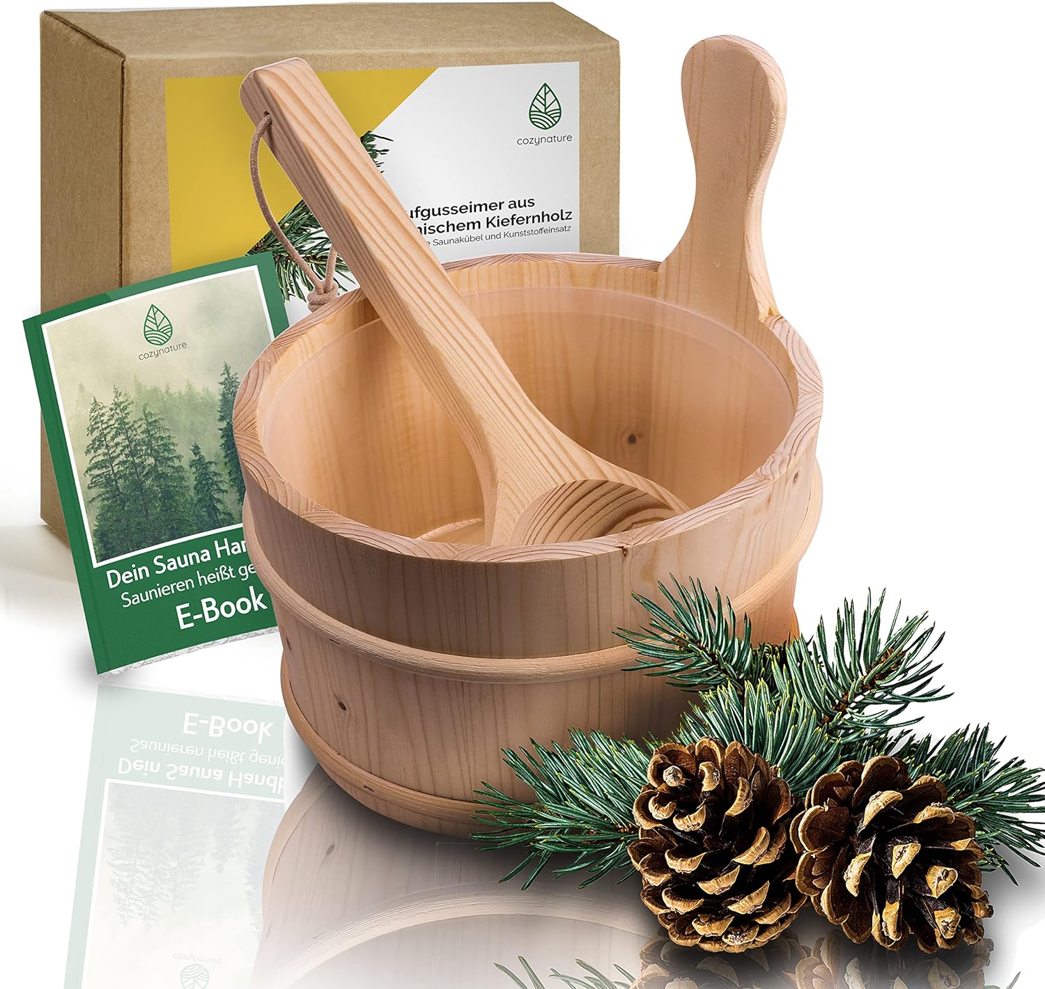 Der CozyNature® Sauna Eimer und die Kelle sind aus 100% finnischem Kiefernholz gefertigt. Dieses Material ist nicht nur für seine Langlebigkeit bekannt, sondern auch für seine hitzebeständigen Eigenschaften, die es ideal für den Einsatz in der Sauna machen. Das handgefertigte Design sorgt für eine hohe Qualität und eine ansprechende Optik, die perfekt in das Ambiente jeder Sauna passt.